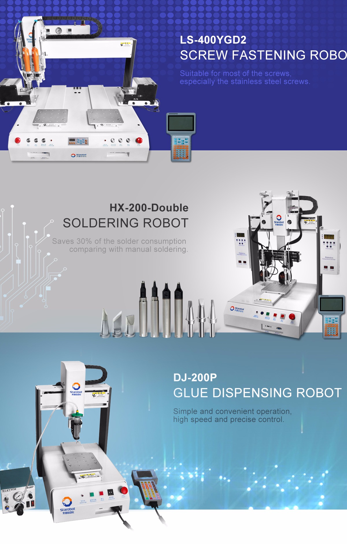 Soldering Robot provides the best solution for soldering job on lead- free, heat dissipating PCB, and high thermal capacity comp0onents.It is suitable for all sort of difficult soldering tasks and micro soldering process. Besides, it saves 30% of the solder consumption comparing to manual soldering.